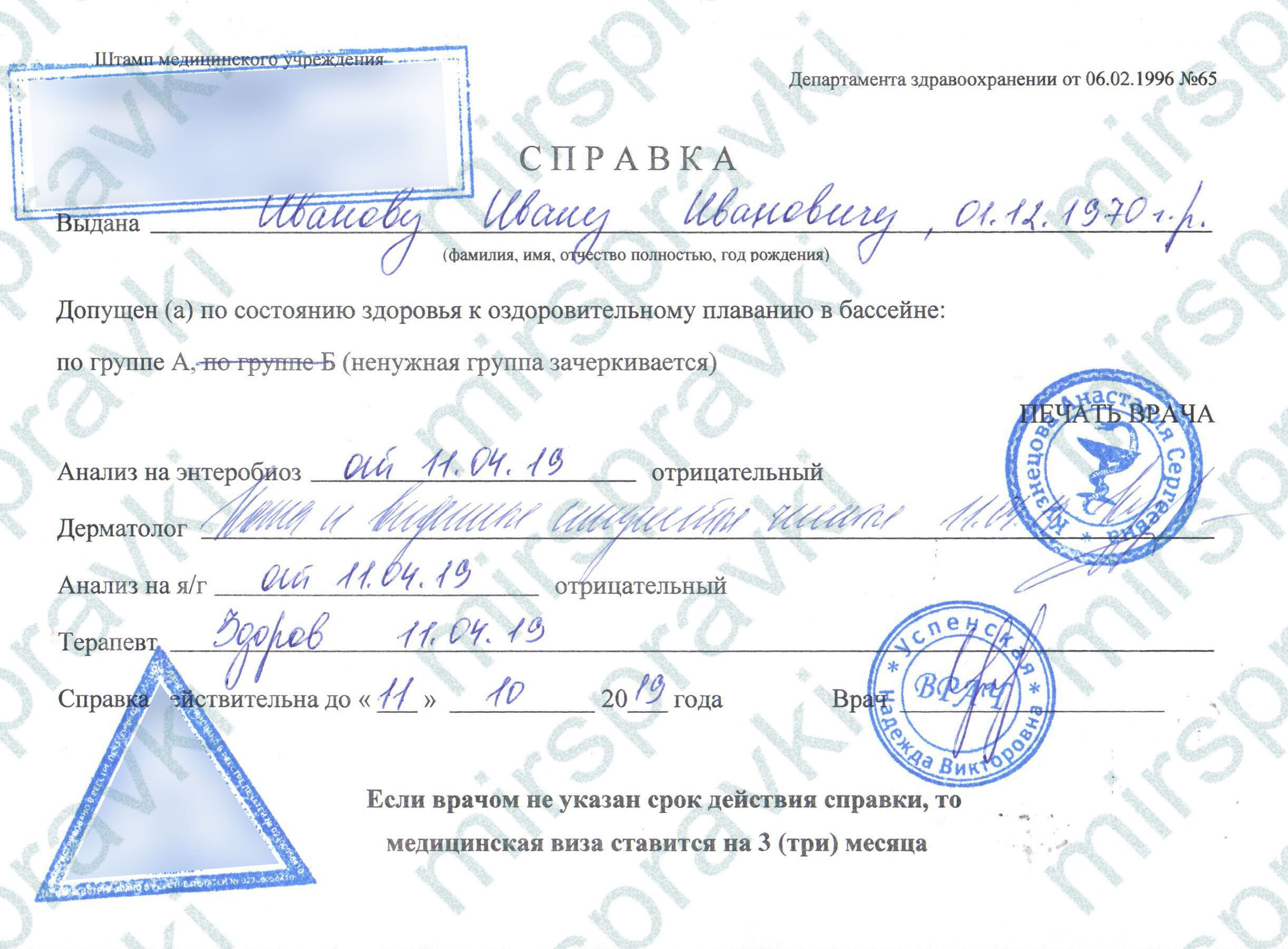 Медицинская справка для бассейна — обязательный документ о состоянии здоровья, который подтверждает отсутствие инфекционных заболеваний, передающихся через воду, а также иных противопоказаний для занятий плаванием. Это необходимо, чтобы избежать распространения заболеваний на других посетителей бассейна. Справка предоставляется администрации бассейна. Согласно предписанию МинЗдрава СанПин 2.1.2.1188-03. для детей обязательна сдача анализа на энтеробиоз.